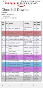 What the Rogue Ratings computer program does for you very accurately is two things. First, it measures the motor of the horses through velocity numbers (lower the number the better). Secondly, it outlines the race shape with early speed numbers projections (higher the number mean more early speed) of which horses look to run early, mid and late in the Oaks or any race. The horses are listed in the order of how they are projected to run in the race on the rogue ratings program page. Both are sophisticated pieces of information not possessed by the public or public handicappers at large and even if they are aware of these concepts most certainly don’t know how to correctly calculate this information in a clear, and useful way!
