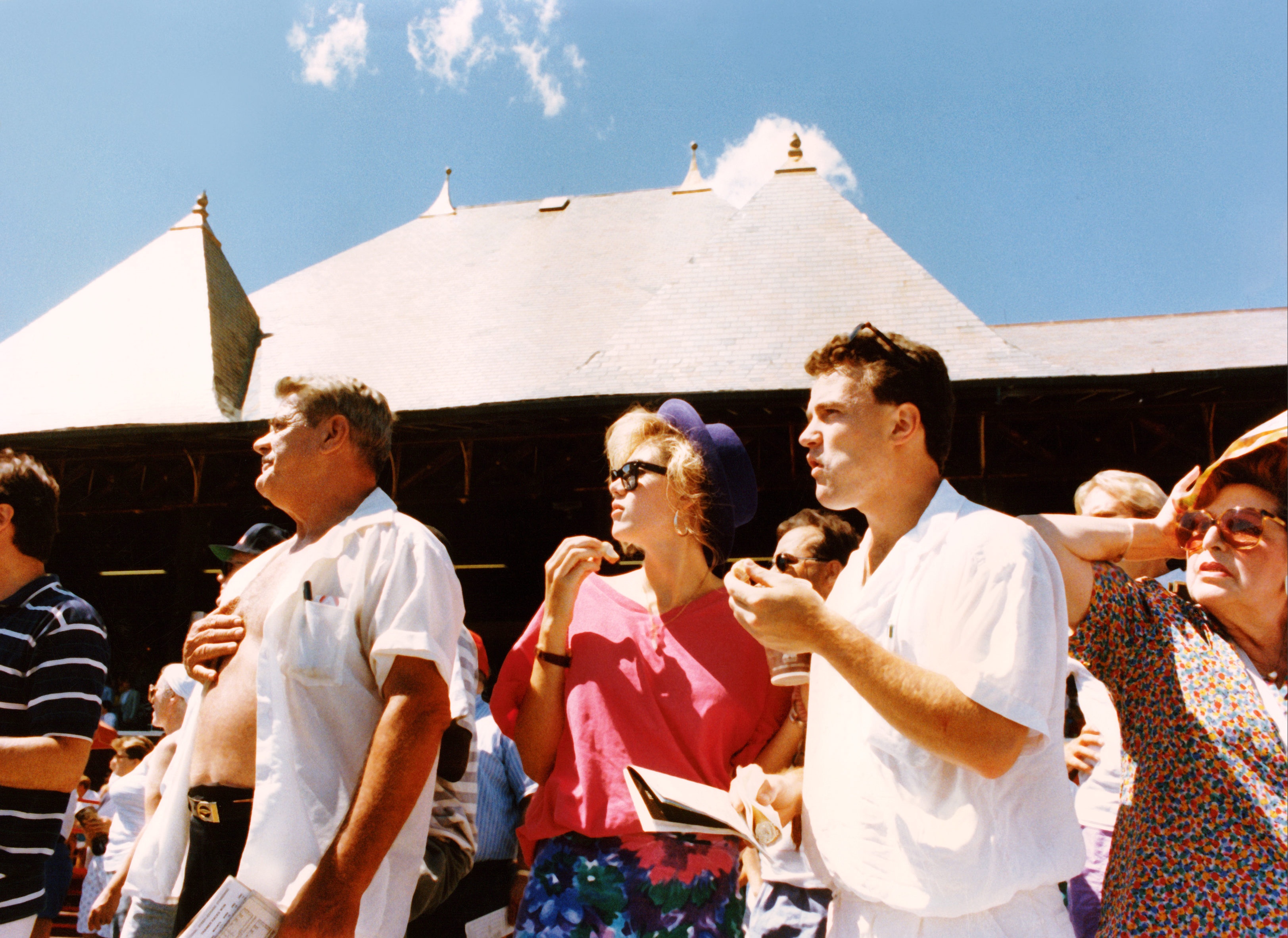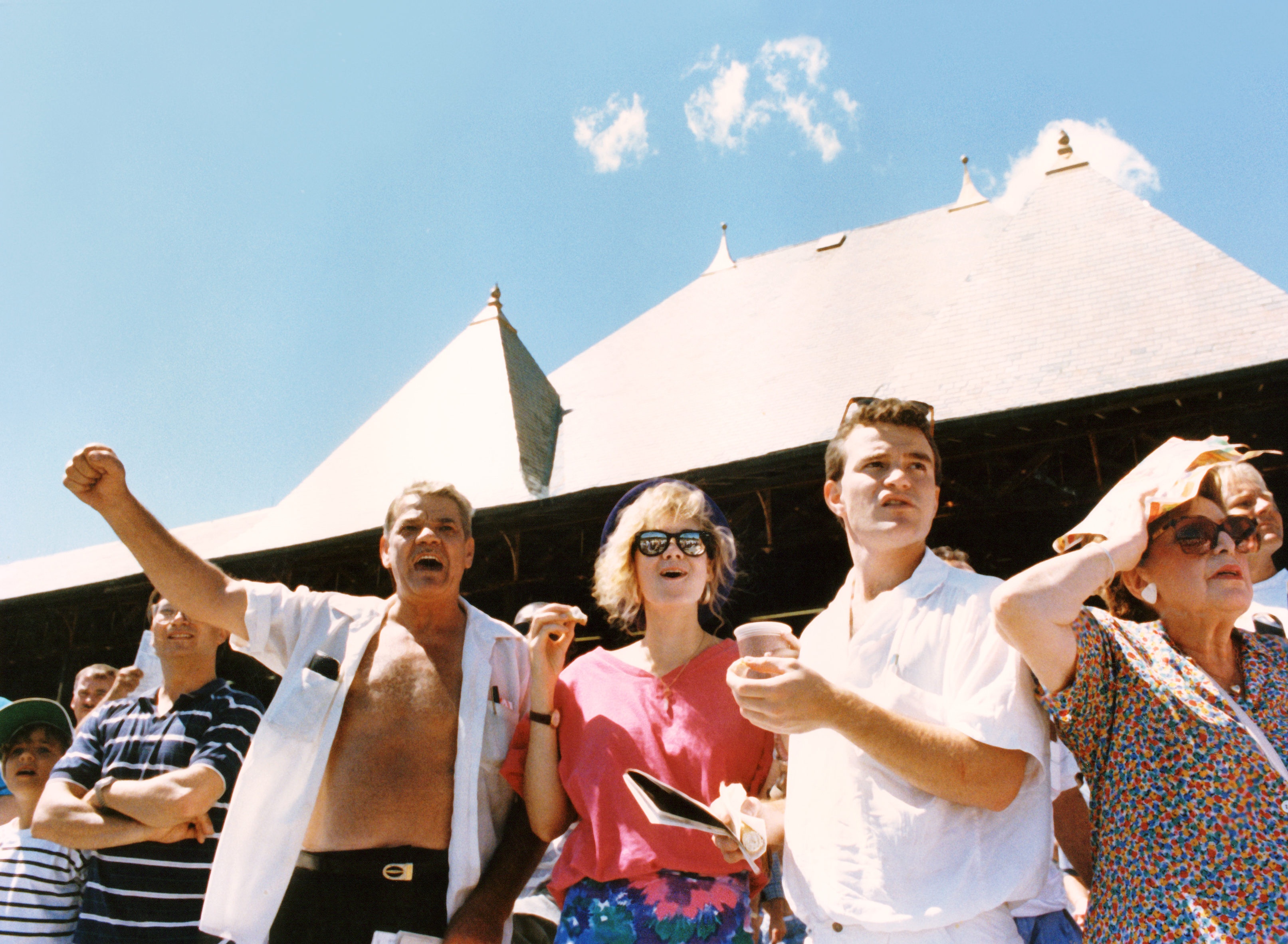 Father and Son at Saratoga cheer on their horses as they approach the finish line