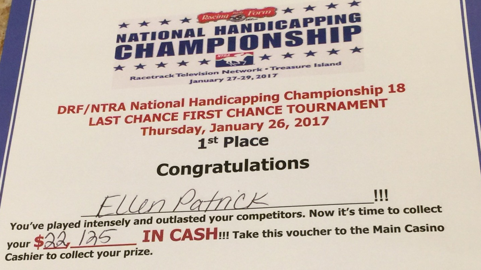 Ellen Patrick wins the Last Chance Contest held on Thursday, January 26, 2017 the day before the NTRA/ NHC 18 Finals in Las Vegas, NV at the Treasure Island Casino. She won with a score of 170.40 that was $14.10 ahead of the second-place finisher. Ellen outpaced a full contest field of 295 participants in the Last Chance Contest which earned her $22,125.00 and an entry into the NHC 18 Finals.