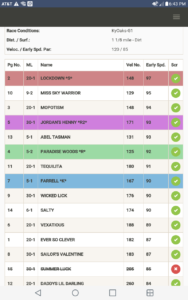 In this race, the #2-Lockdown is a projected play being listed as the Speed Horse *S* highlighted in red which means she has the best early speed with a low velocity number.