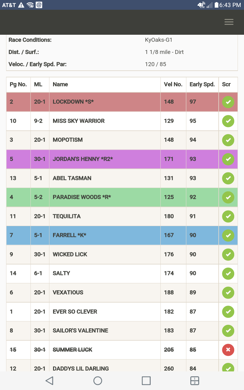 What the Rogue Ratings does for you very accurately is two key things, first, it measures the motor of the horses through velocity numbers (lower the better) and second, it outlines the race shape with early speed numbers (higher number means more early speed) of which horses look to run early, mid and late in the Kentucky Oaks. This is sophisticated information not possessed by the public or public handicappers!